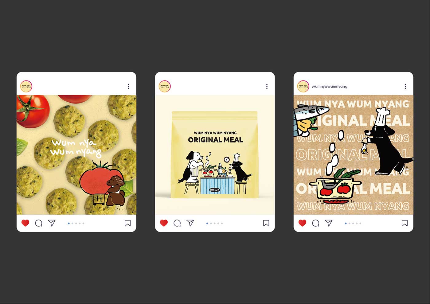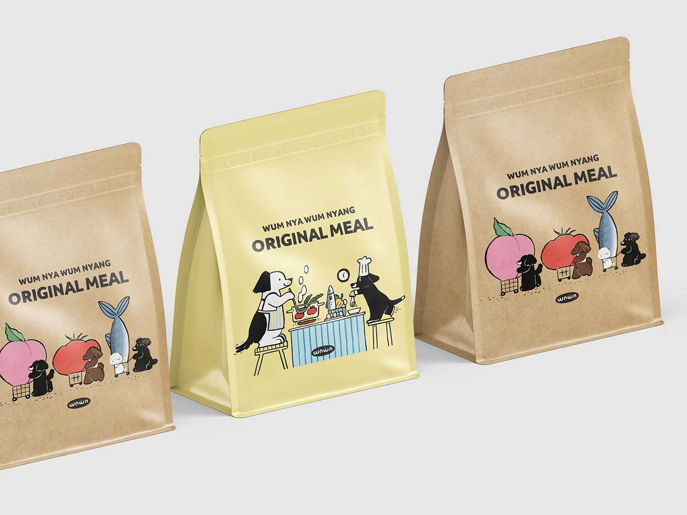 밝고 명랑한 강아지의 일상과 견주의 사랑과 행복을 담아내는 방향으로 디자인을 기획했습니다. 강아지를 의인화하여 스스로 먹을 음식을 요리하는 ‘강아지 가족’이라는 스토리형 콘셉트를 적용함으로써, 따뜻하고 친근한 브랜드 이미지를 전달하는 패키지 디자인을 완성했습니다.